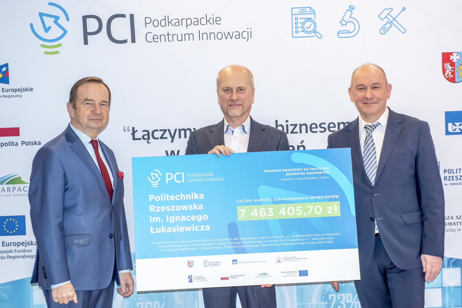 Naukowcy z Politechniki Rzeszowskiej otrzymali blisko 7,5 mln zł na realizację projektów badawczo-rozwojowych w ramach programu grantowego Podkarpackiego Centrum Innowacji. Symboliczne czeki przedstawicielom uczelni wręczył marszałek województwa podkarpackiego Władysław Ortyl. Naszą uczelnię reprezentował prorektor ds. rozwoju i współpracy z otoczeniem prof. dr hab. inż. Jarosław Sęp