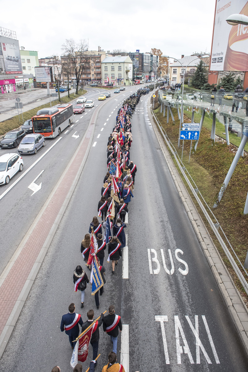 Następnie przedstawiciele władz wojewódzkich, reprezentacje uczelni wyższych, parlamentarzyści, kombatanci, żołnierze, mieszkańcy Rzeszowa i Podkarpacia zgromadzili się na Placu Wolności, gdzie kontynuowano uroczystość. Politechnikę Rzeszowską reprezentowali dr hab. inż. Grzegorz Masłowski, prof. PRz, Prorektor ds. kształcenia oraz mgr Andrzej Sowa, Kanclerz. Tam odbyło się złożenie meldunku dowódcy garnizonu Rzeszów i odśpiewano hymn narodowy. Kulminacyjnym punktem obchodów było odsłonięcie pomnika Marszałka Józefa Piłsudskiego.