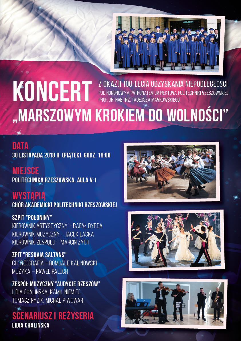 Chór akademicki Politechniki Rzeszowskiej serdecznie zaprasza na koncert Marszowym Krokiem do Wolności, który odbędzie się pod patronatem rektora Politechniki Rzeszowskiej prof. dr. hab. inż. Tadeusza Markowskiego, w dniu 30 listopada 2018 r. o godz. 18:00 w auli V-1 Politechniki Rzeszowskiej.